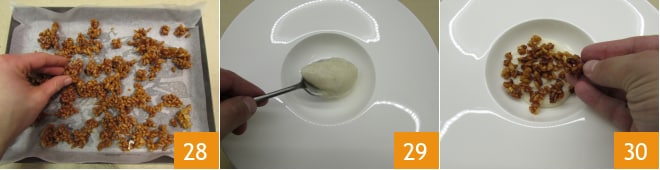 Déjalo enfriar y luego desmenúzalo con las manos, sin pulverizar el arroz pero intentando separar los granos 28. Ahora todo está listo, puedes emplatar. En el fondo del plato, vierte la crema de arroz tibia 29, luego añade el arroz crujiente para cubrir la crema 30 y un poco de granillo fino de avellanas.