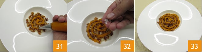 Completa el plato realizando una espiral de crema de calabaza 31 y unos copos de sal maldon 32. ¡Tu postre de arroz con leche y calabaza está listo para disfrutar 33!