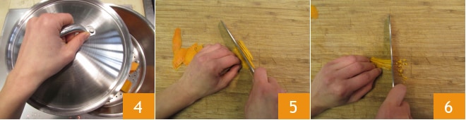 Cubre con una tapa y cocina durante aproximadamente 20 minutos 4. Mientras tanto, prepara la polenta de arroz. Retira la piel de la naranja y córtala primero en tiras 5 y luego en cubos muy pequeños 6.