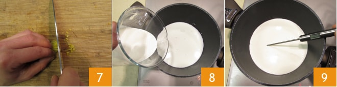 Haz lo mismo con la piel del limón 7. En un cazo, vierte leche y nata 8, ponlo al fuego y calienta hasta alcanzar una temperatura de 60° 9.