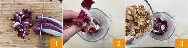 Para preparar el arroz con pesto de achicoria, remolacha y caqui, empieza por el pesto: lava, seca y luego corta la achicoria en tiras gruesas 1, colócalas en un vaso alto 2, añade las nueces 3.
