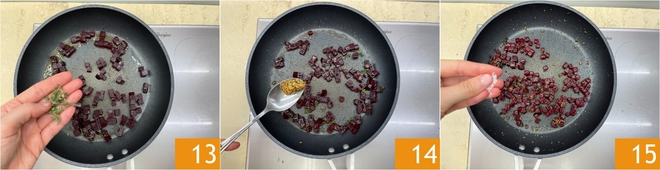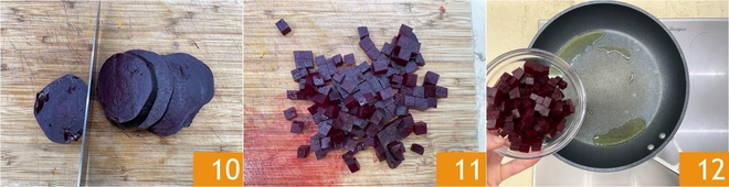 Corta la remolacha en rodajas 10 y luego en cubos 11 de aproximadamente 1 cm. Calienta una sartén con un chorro de aceite y agrega la remolacha 12.