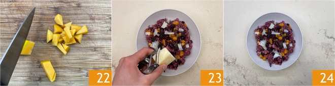 Agrega también los cubos de remolacha 19 (reservando algunos para la presentación) y mezcla 20. Divide el caqui por la mitad 21.