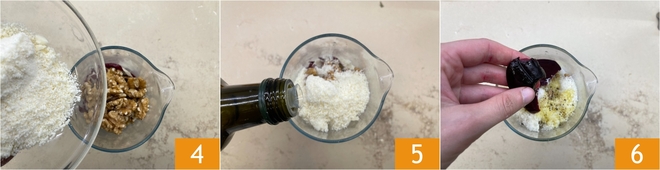 Sazona con 50 g de Parmigiano Reggiano DOP 4, aceite 5, sal, pimienta, las remolachas precocidas 6.