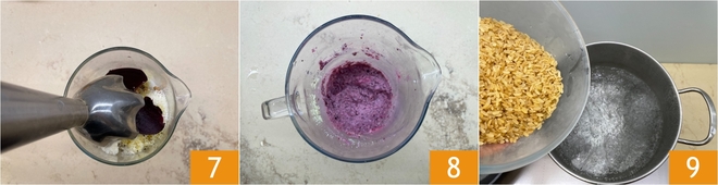 Tritura con una batidora de mano 7 hasta obtener una mezcla homogénea 8, añade un poco de agua si es necesario y guarda en el refrigerador. Hierve el arroz según el tiempo indicado en el paquete 9.