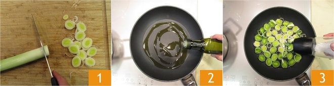 Para preparar el arroz integral tibio, cortad finamente, aproximadamente 5 mm, el puerro eliminando el extremo con las raíces 1. Verted un hilo de aceite en una sartén, añadid el puerro teniendo cuidado de no superponer las rodajas. Sal 3 y pimienta.