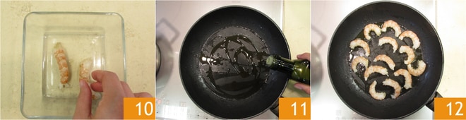Quitad el caparazón 10. En la misma sartén en la que cocinasteis el puerro, verted un hilo de aceite 11 y añadid las gambas previamente peladas 12.