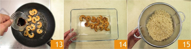 Cocinad a fuego vivo 1 minuto por lado. Añadid la salsa de soja 13 y coced durante un par de minutos. Transferid las gambas a una fuente 14 y reservad. Escurrid el arroz ya cocido 15.