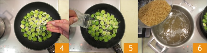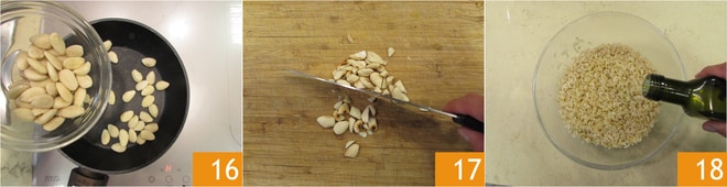 Saltead las almendras enteras en la sartén 16 hasta que estén doradas y luego picadlas groseramente 17. Transferid el arroz tibio a un bol amplio, condimentad con aceite 18.