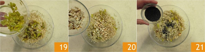 Incorporad el puerro 19, las almendras picadas 20 y el sésamo negro 21.