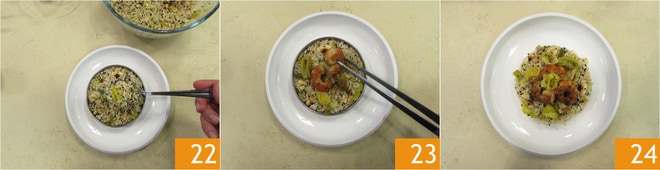 Mezclad todo. Emplatad usando un aro de 10 cm y presionando ligeramente el arroz dentro 22. Terminad el plato con las gambas salteadas a la soja 23 y un hilo de aceite en crudo 24.