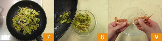 Una vez cocido 7, transferid el puerro a un bol 8 y reservadlo. Separad la cabeza de las gambas 9.