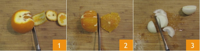 Para realizar el asado a la naranja, lo primero que hay que hacer es pelar la naranja a vivo 1 y cortarla en rodajas 2. Limpiar y cortar la cebolla 3. Luego atar la carne siguiendo nuestra guía Cómo atar el asado.