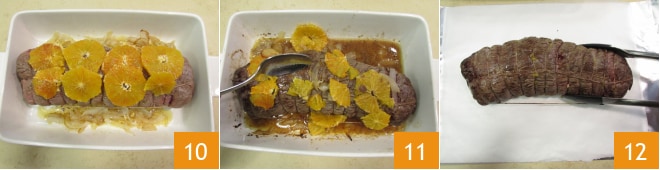 Coloca en la superficie las rodajas de naranja peladas al vivo 10. Cocina en horno estático precalentado a 170°, cuidando de monitorear la cocción con una sonda puesta en el corazón de la carne y cocina hasta que alcance una temperatura de 60° (tomará aproximadamente 40-45 minutos). Durante la cocción, rocía de vez en cuando la superficie con el fondo 11. Saca la carne del horno 12.
