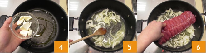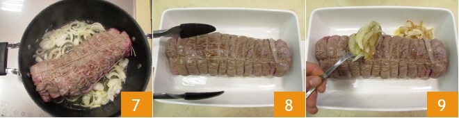 Sella la carne a fuego alto por todos lados 7. Transfiere la carne 8 y las cebollas 9 a una bandeja para horno.