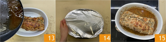Vierte el fondo de cocción sobre la carne 13, cubre con aluminio 14 y cocina por una hora y media en horno estático precalentado a 180°, o hasta que la carne alcance en el centro una temperatura interna de 70°-75°. En este punto saca el asado del horno 15.