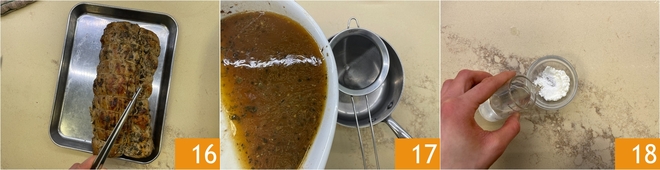 Transfiere la carne a una bandeja 16 y déjala reposar durante 5 minutos, cubriéndola con un papel de aluminio. Filtra el fondo de cocción directamente en un cazo. En un tazón aparte vierte la maicena y el agua 18.