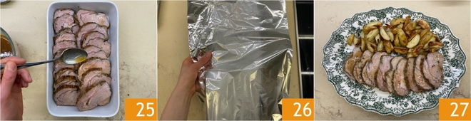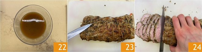 Debes obtener una salsa más densa, pero aún bastante líquida 22. Si tienes la intención de servir el asado de inmediato, elimina el hilo de la carne 23 y córtala en rodajas 24, luego sírvelas con la salsa.