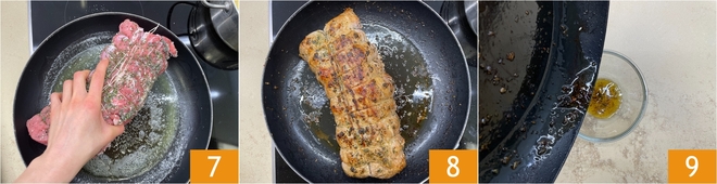 Cuando la mantequilla esté derretida, coloca la carne en la cazuela 7 y dórala bien por todos lados 8; tomará entre 5 y 10 minutos. Tan pronto como la carne esté bien dorada, transfiérela a una bandeja para horno y recoge el fondo de cocción en un tazón 9. Al eliminar la parte grasa obtendrás una salsa más ligera.