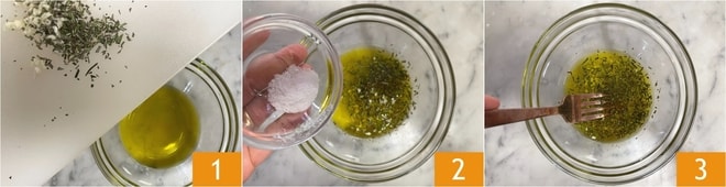 Para preparar el asado de ternera, primero pique finamente el ajo y las agujas de romero. Vierta 2 cucharadas de aceite en un bol pequeño, añada el ajo y el romero picados 1 y la sal 2, luego emulsione con un tenedor 3.