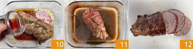 En este punto, rocíe la carne con el vino tinto 10 y continúe la cocción durante otros 40 minutos siempre a 150°, cubriendo la carne con una hoja de aluminio. Un par de veces, durante la cocción, rocíe la carne teniendo cuidado de no quemarse. Una vez cocido, saque el asado del horno y déjelo reposar durante unos diez minutos antes de quitar el hilo 11. Corte su asado de ternera en rodajas 12 y sírvalas cubiertas con el fondo de cocción.