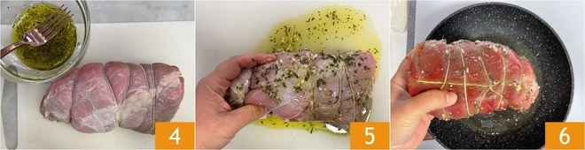 Cómo atar el asado el redondo de ternera con hilo de cocina insertando una ramita de romero, luego cubra con la emulsión 4 y masajee la carne con las manos para que se absorba bien 5. Deje reposar en el refrigerador durante 10 minutos. Pasado este tiempo, coloque la carne en una sartén caliente y bien engrasada 6.
