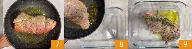Dore la carne por todos los lados para sellarla 7. Cuando el asado esté bien dorado, transfiéralo a una bandeja junto con el fondo de cocción, asegurándose de que el fondo de la bandeja esté bien engrasado 8. Cocine en horno estático precalentado a 150° durante unos 20 minutos 9.