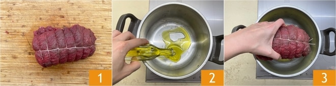 Para preparar el asado en olla a presión, lo primero que debes hacer es tomar la pieza de carne atada 1, de lo contrario, consulta nuestra guía: Cómo atar el asado para hacerlo tú mismo. Vierte un poco de aceite en una olla a presión con una capacidad de 4,5 L 2 y caliéntalo a fuego medio-alto. Luego, introduce el asado en el interior 3.
