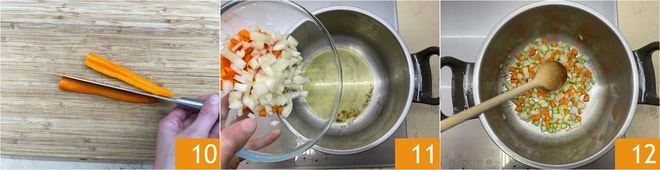 Haz lo mismo con la zanahoria 10. Vuelve a verter un poco de aceite en la misma olla y añade las verduras 11. Déjalas estofar a fuego medio-bajo 12.