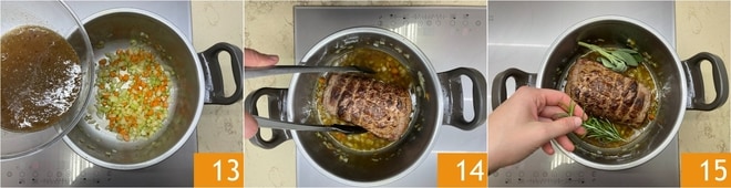 Vierte el fondo de cocción que habías reservado 13, coloca nuevamente el asado en el interior 14 y añade las hierbas aromáticas 15.