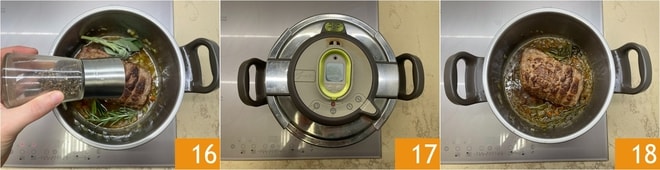 Añade también una pizca de sal y una ralladura de pimienta 16. Cierra la olla a presión 17 y cocina siempre a fuego medio-alto. Tan pronto como esté bajo presión (escucharás un silbido continuo), baja el fuego para reducirlo a medio y calcula 20 minutos. Pasado este tiempo, apaga y deja que la olla se descomprima por completo. Tan pronto como ya no esté bajo presión podrás abrir la tapa. ¡El asado en olla a presión está listo 18!