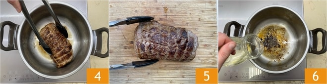 Séllalo bien por todos lados girándolo con unas pinzas de vez en cuando 4, procurando no perforarlo. Luego, transfiérelo a una tabla de cortar 5 y vierte el vino blanco en la olla 6.