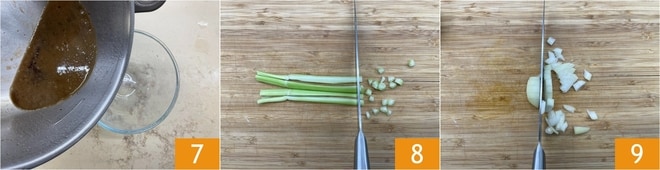 Desglasar el fondo de cocción y verter el líquido en un bol pequeño 7. Picar groseramente el apio 8 y la cebolla 9.