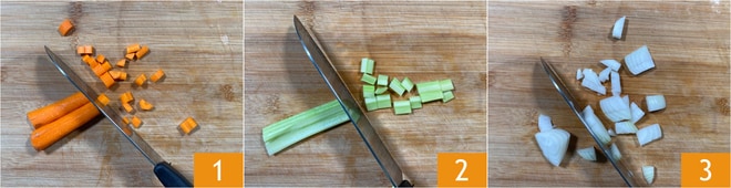 Para preparar el asado de ternera en sartén, como primer paso preparad el Caldo de verduras siguiendo nuestra receta, y mantenedlo caliente. Picar las zanahorias 1, el apio 2 y la cebolla 3 con un cuchillo.