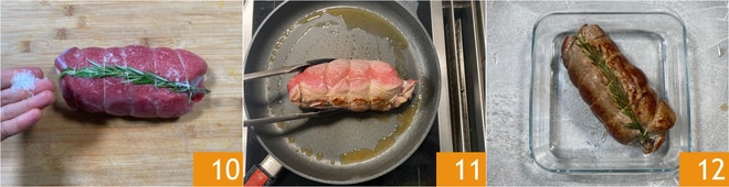 Continuad con el Cómo atar el asado de la pieza de ternera insertando una ramita de romero. Salar la carne por todos los lados 10. Verted un chorrito de aceite en la sartén y dorad el asado por todos los lados 11 a llama medio-alta. Retiradlo de la sartén y pasadlo a una fuente 12.