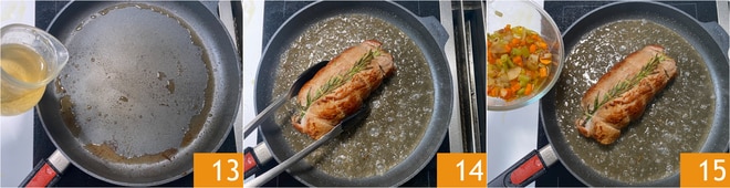 Verted el vino blanco en la sartén 13 y desglasad el fondo. En este punto, volved a poner el asado en la sartén 14 y añadid las verduras 15.