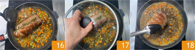 Añadid el caldo 16, cubrid con la tapa 17 y cocinad durante 50 minutos a fuego medio-bajo, girando a mitad de cocción 18. El asado debe mantenerse húmedo, por lo que, con una cuchara, debéis bañarlo a menudo con su fondo de cocción. Si tenéis forma de medir la temperatura interna de la carne, el asado estará listo a una temperatura entre 60-65°C.