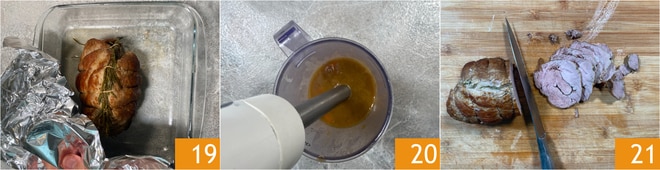 Pasad el asado a una fuente, cubridlo con una hoja de aluminio 19 y dejadlo reposar durante 50-60 minutos. Mientras tanto, pasad las verduras a un vaso y, con una batidora de inmersión, triturad hasta obtener una crema lisa y homogénea 20. Probad y, si es necesario, ajustad de sal y pimienta. Transcurrido el tiempo de reposo, cortad el asado en rodajas de aproximadamente 1 cm de grosor 21.