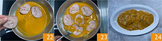 Verted en la sartén la crema y calentad durante unos instantes, después añadid las rodajas de asado 22. Cubrid las rodajas con la crema 23, cerrad con la tapa y cocinad durante 2 minutos. Emplatad y completad con romero fresco. ¡Vuestro asado de ternera en sartén está listo para ser disfrutado 24!