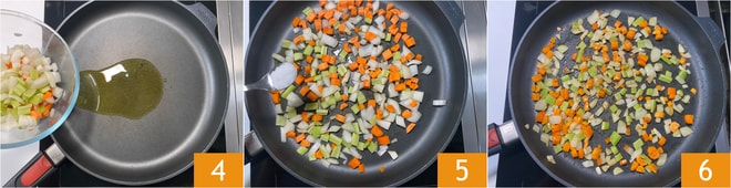 En una sartén verted un chorrito de aceite, añadid las verduras 4, ajustad de sal 5 y dejad dorar a fuego medio-bajo durante unos 10 minutos 6, después trasladadlas a un bol.