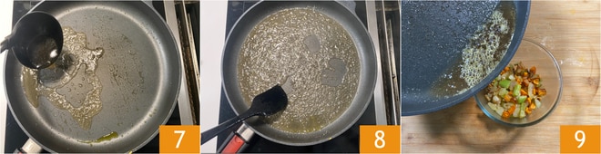 Verted en la sartén un cucharón abundante de caldo vegetal 7 y desglasad el fondo de la sartén 8 para obtener una salsita ligeramente reducida. Pasad el líquido sobre las verduras 9.