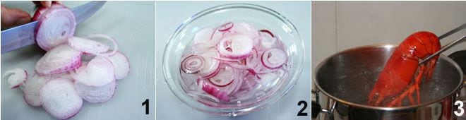 Para preparar el bogavante a la catalana, comienza cortando en rodajas finas la cebolla roja 1 (mejor si es de Tropea) y ponla a remojo en un bol cubierto con agua 2 y una cucharada de vinagre durante al menos 20 min.
