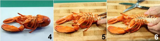 Saca el bogavante de la olla y colócalo en la tabla de cortar 4; con ayuda de unas tijeras de cocina, corta la coraza del bogavante 5 en la parte del abdomen a lo largo, luego abre la coraza y extrae toda la carne. 6