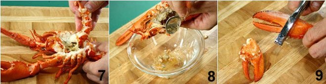 Una vez abierto el bogavante en dos partes 7, corta la carne del bogavante en rodajas, mientras que con ayuda de la herramienta adecuada o, en su defecto, con un cascanueces (8-9), rompe el caparazón de las pinzas y recupera toda la carne interna extrayéndola entera (tendrá la misma forma que las pinzas).
