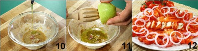 Corta ahora los tomates, condiméntalos con aceite y sal y extiende una cama de ellos en un plato de servir, coloca encima la carne del bogavante cortada en rodajas y las pinzas, adorna con las rodajas de cebolla previamente escurridas y vierte la salsita preparada con aceite, limón y la parte blanda del bogavante recogida con la cucharita. 12