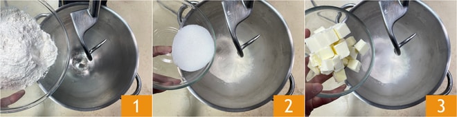 Para preparar el babá tendrás que poner en el congelador 3 huevos la noche anterior: recomendamos cascar los huevos y verterlos en moldes de silicona, de modo que luego sea más fácil extraerlos. La mantequilla y los huevos restantes deberán estar fríos del frigorífico. Vierte en una amasadora la harina 1, junto con el azúcar 2 y la mantequilla fría del frigorífico cortada en trozos 3.