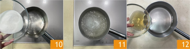 Mientras tanto, puedes preparar el almíbar que necesita más reposo, y que servirá para bañar los babás antes de servirlos. Vierte el agua y el azúcar en un cazo 10 y lleva a ebullición. Apaga y deja enfriar completamente. Solo cuando esté fría podrás añadir el ron a 70° 12. Guarda el almíbar en el frigorífico y cúbrelo con papel film.