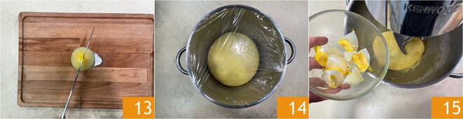Mientras tanto, retoma el trabajo de la masa: saca los 3 huevos del congelador, y divídelos en partes, para añadirlos a la amasadora poco a poco 13. En esta fase se debe tener mucha paciencia: introduce en la amasadora la masa que habrá duplicado su volumen 14, luego comienza a hacerla girar a velocidad baja y luego media-baja. Introduce un trozo de huevo congelado a la vez para que se absorba completamente antes de añadir otro 15.