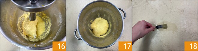 Se necesitarán al menos 30-40 minutos para que todos los huevos se incorporen totalmente 16, recomendamos no tener prisa en esta fase. Como mucho se puede aumentar la velocidad de la amasadora de vez en cuando, pero la masa no deberá calentarse excesivamente, de lo contrario no se formará correctamente la red de gluten. Una vez lista la masa 17, engrasa los moldes de una capacidad de aproximadamente 70 g, luego engrasa ligeramente la superficie de trabajo 18.