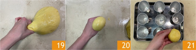 Voltea la masa sobre la superficie de trabajo, da algunas vueltas de refuerzo y luego, para hacer un bocadito de aproximadamente 30-40 g a la vez, tira de un extremo de la masa con una mano 19 y pellizca para hacerlo salir entre el índice y el pulgar, con la mano cerrada 20. Coloca cada pieza en los moldes engrasados, que habrás colocado en una bandeja 21.